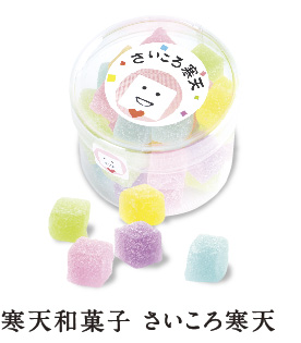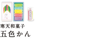 寒天を使用し、昔ながらの製法を生かして巨峰、いちご、メロン、ラムネ、グレープフルーツの五色の寒天ぜりいを短冊にしました。寒天は、テングサ、オゴノリなどの海藻からつくられた日本の伝統的な和菓子の原料です。